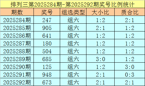 上期追想:成列三第2025292奖号开出673,奖号质合比为2:1山东大庚工贸有限公司,大小比为2:1,跨度为4,类型为组六。